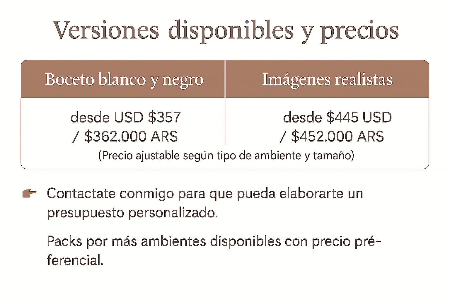 Podés elegir entre imágenes realistas (renders) o bocetos en blanco y negro, según tu etapa y presupuesto.